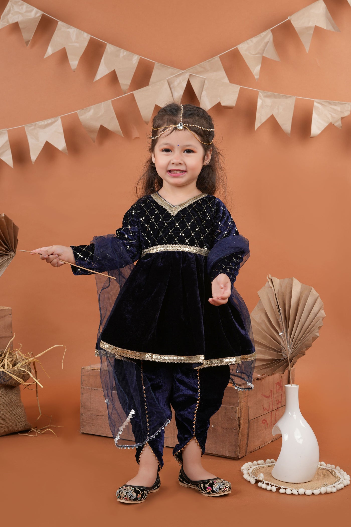 Full sleeves navy velvet top with dhoti -Nabyblue - 1-2y
