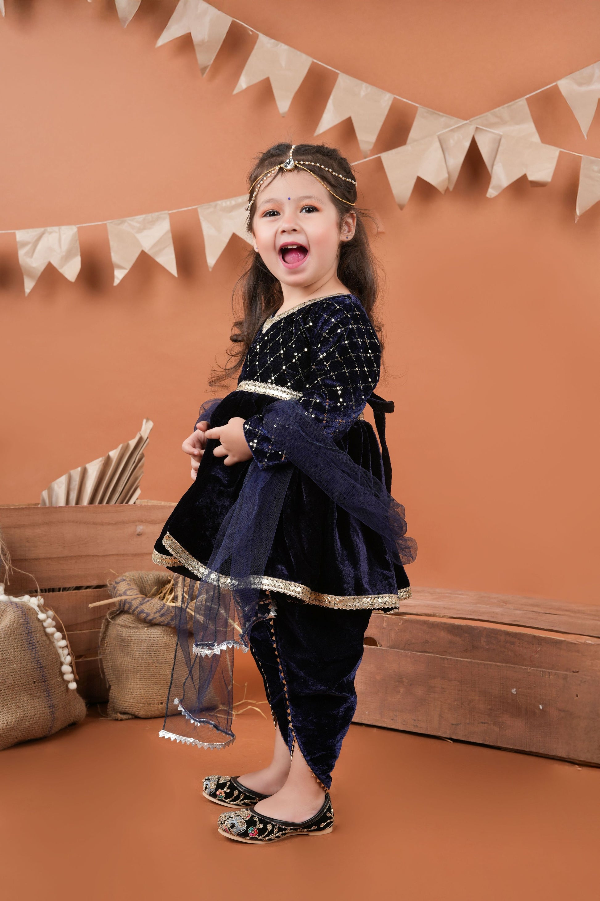 Full sleeves navy velvet top with dhoti -Nabyblue