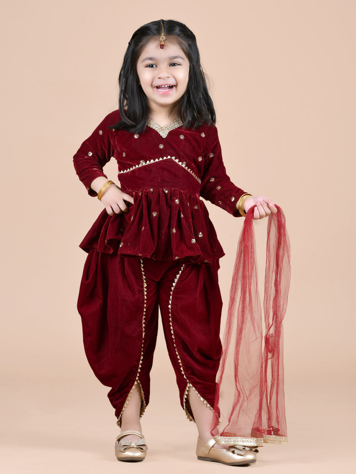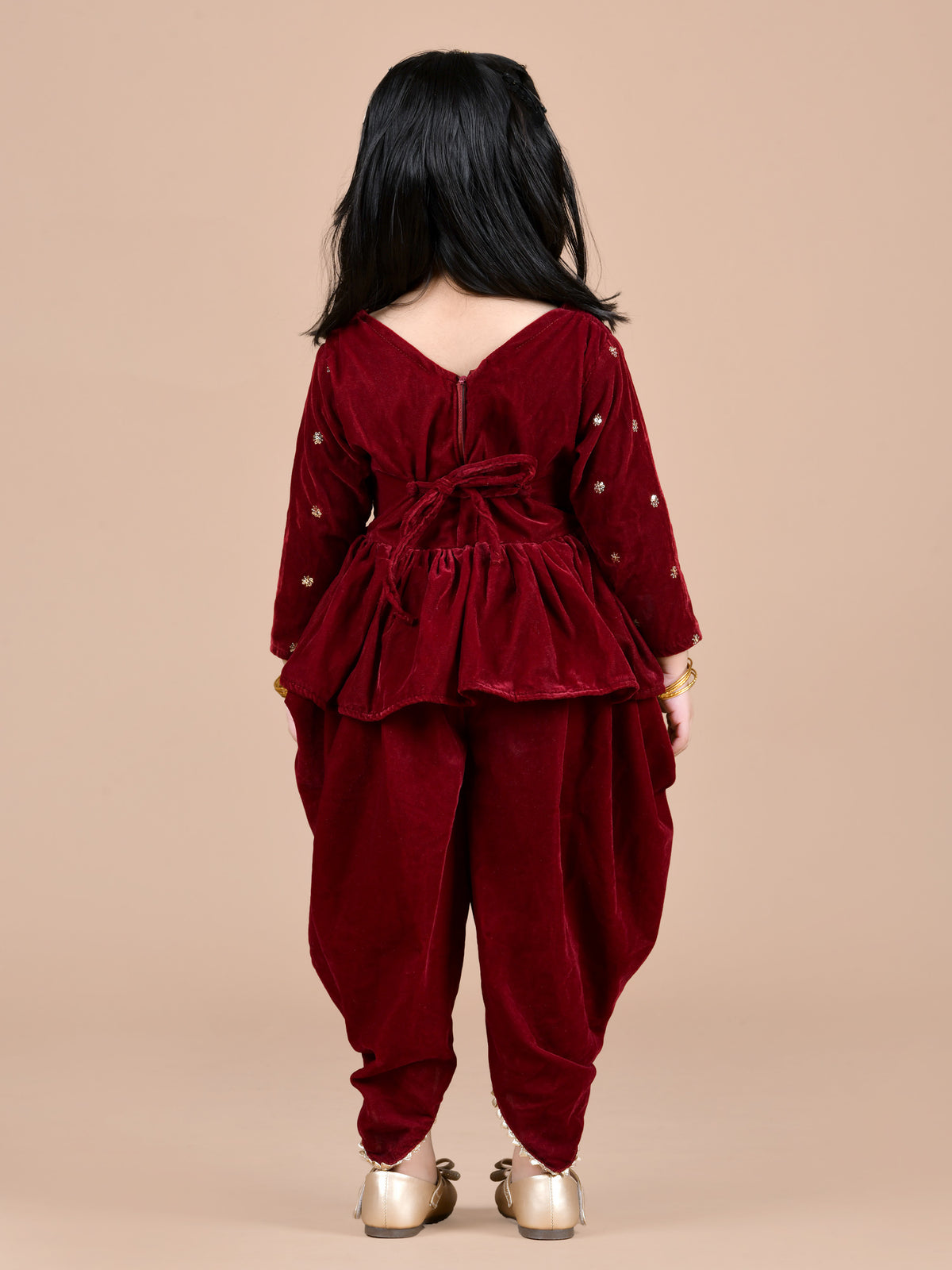velvet peplum top with dhoti -Maroon - 1-2y